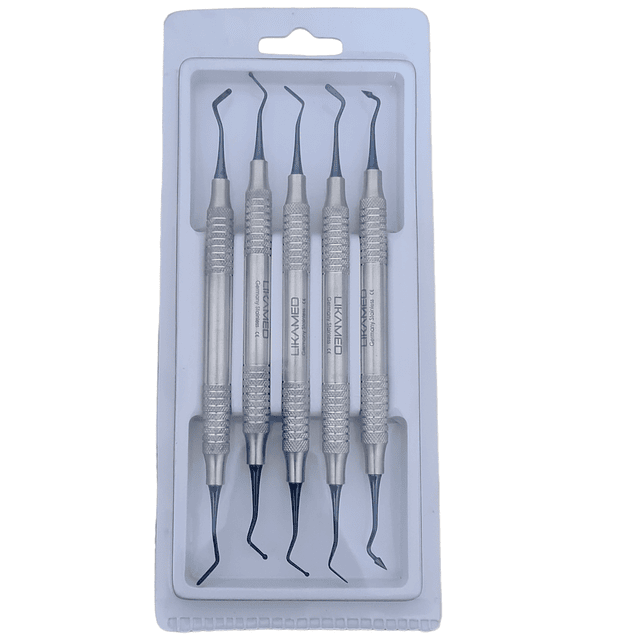 Set de espatulas para resina, son instrumentos para resina compuesta, especialmente diseñados para colocar, condensar y tallar la resina compuesta en restauraciones dentales.